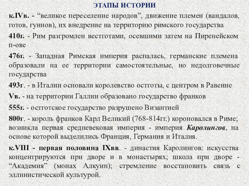 вестготами, осевшими затем на Пиренейском п-ове476г. - Западная Римская империя распалась, германские племена образовали на ее территории самостоятельные, но недолговечные государства