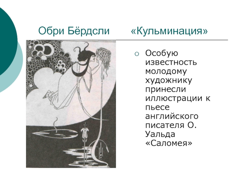 Обри Бёрдсли    «Кульминация»Особую известность молодому художнику принесли иллюстрации к пьесе английского писателя О.Уальда «Саломея»