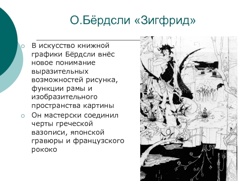 О.Бёрдсли «Зигфрид»В искусство книжной графики Бёрдсли внёс новое понимание выразительных возможностей рисунка, функции рамы и изобразительного пространства