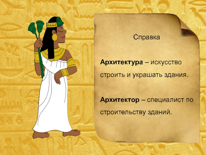 СправкаАрхитектура – искусство строить и украшать здания.Архитектор – специалист по строительству зданий.