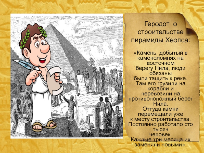 Геродот о строительстве пирамиды Хеопса:«Камень, добытый в каменоломнях на восточномберегу Нила, люди обязаныбыли тащить к реке. Там