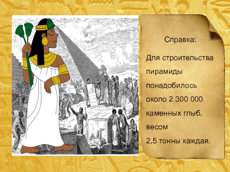 Справка:Для строительства пирамиды понадобилось около 2 300 000 каменных глыб, весом 2,5 тонны каждая.
