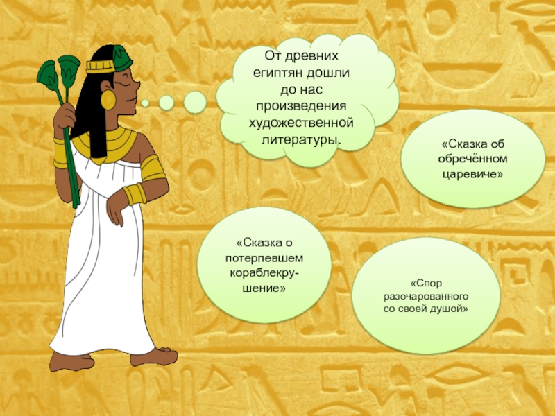 От древних египтян дошли до нас произведения художественной литературы.«Спор разочарованного со своей душой»«Сказка о потерпевшем кораблекру-шение»«Сказка об