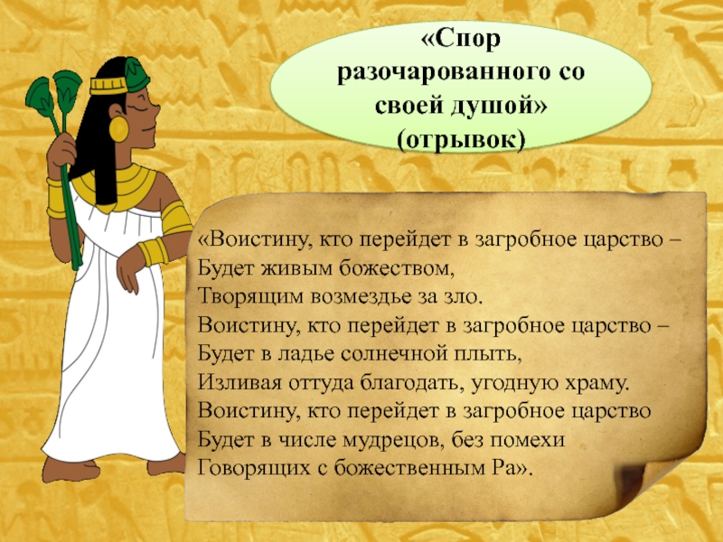 «Спор разочарованного со своей душой» (отрывок)«Воистину, кто перейдет в загробное царство –Будет живым божеством,Творящим возмездье за зло.Воистину,