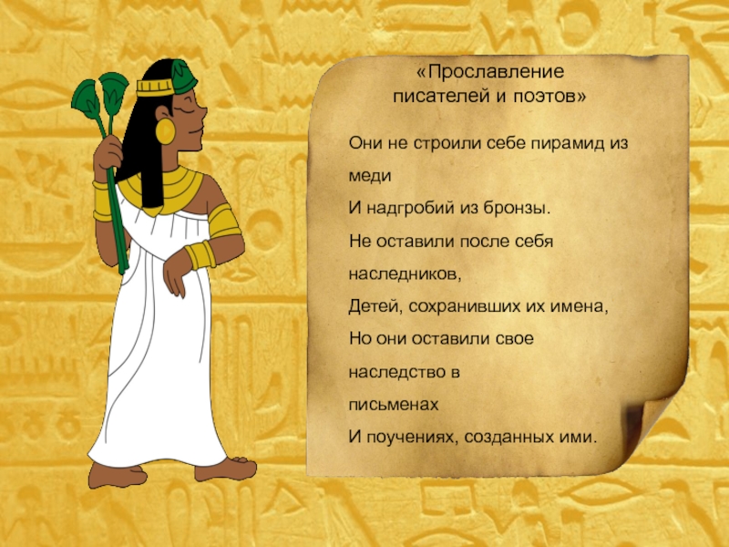 «Прославление писателей и поэтов»Они не строили себе пирамид из медиИ надгробий из бронзы.Не оставили после себя наследников,Детей,