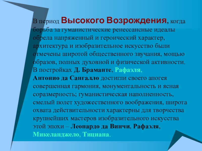 Слайд 12В период Высокого Возрождения, когда борьба за гуманистические ренессансные идеалы