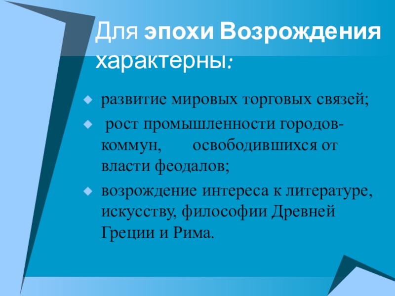 Слайд 3Для эпохи Возрождения характерны: