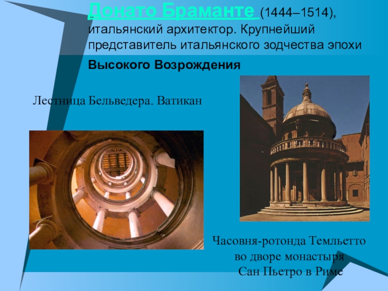 Слайд 13Донато Браманте (1444–1514), итальянский архитектор. Крупнейший представитель итальянского зодчества эпохи