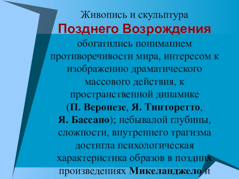 Я. Бассано); небывалой глубины, сложности, внутреннего трагизма достигла психологическая характеристика образов в поздних произведениях Микеланджело и Тициана.