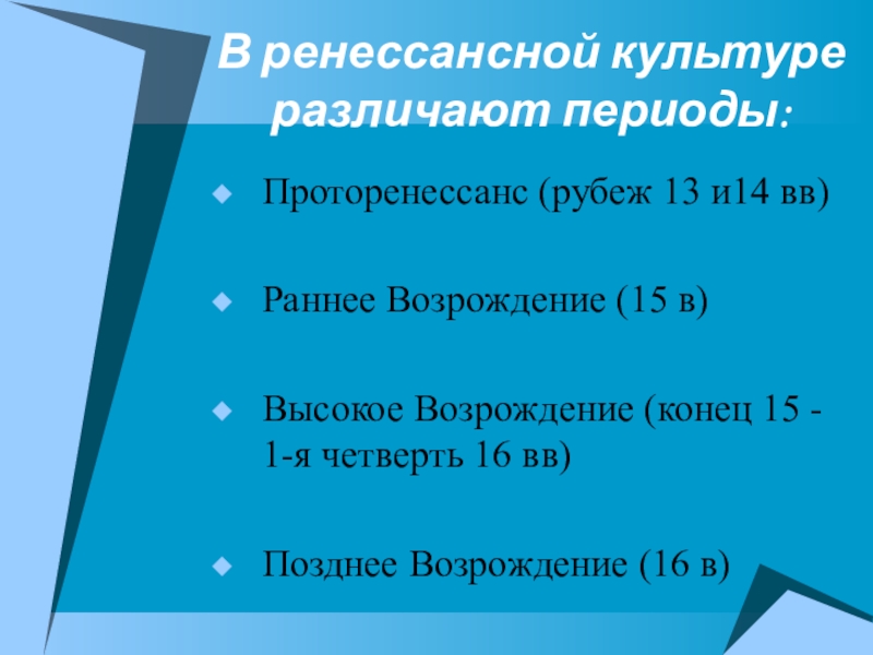 Слайд 4В ренессансной культуре различают периоды: