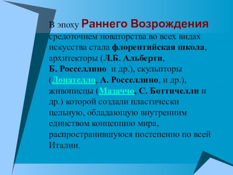 А. Росселлино, и др.), живописцы (Мазаччо, С. Боттичелли и др.) которой создали пластически цельную, обладающую внутренним единством концепцию мира, распространившуюся постепенно по всей Италии.