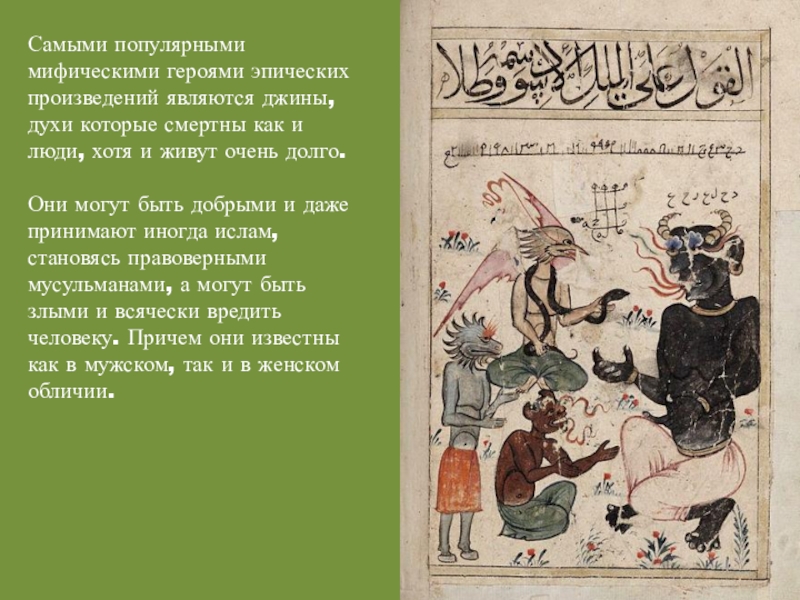 Слайд 82Самыми популярными мифическими героями эпических произведений являются джины, духи которые