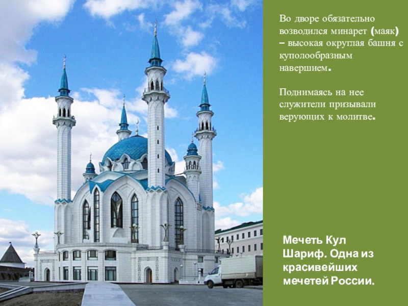 Слайд 65Мечеть ориентирована на священный город Мекку. Поэтому стена обращенная в