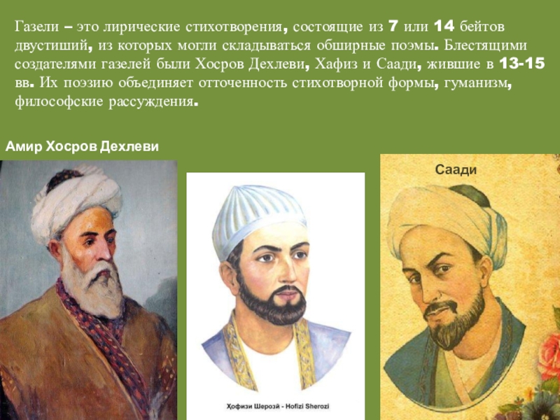 газелей были Хосров Дехлеви, Хафиз и Саади, жившие в 13-15 вв. Их поэзию объединяет отточенность стихотворной формы, гуманизм, философские рассуждения.