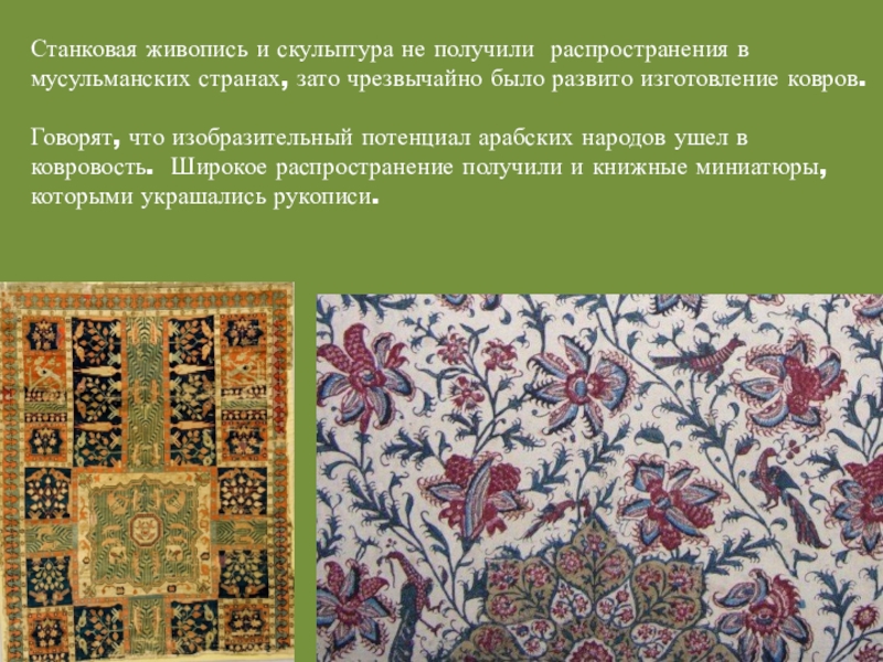 Слайд 73Станковая живопись и скульптура не получили распространения в мусульманских странах,