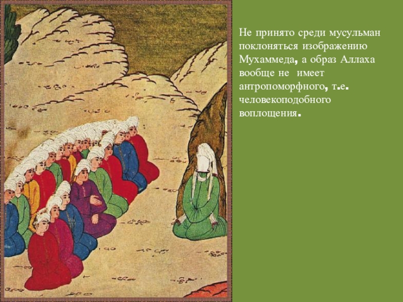 Слайд 70Не принято среди мусульман поклоняться изображению Мухаммеда, а образ Аллаха