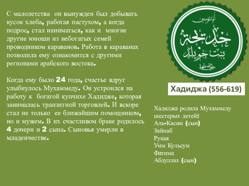 Слайд 11Мухаммед рано остался без родителей. Отец погиб сопровождая караваны еще