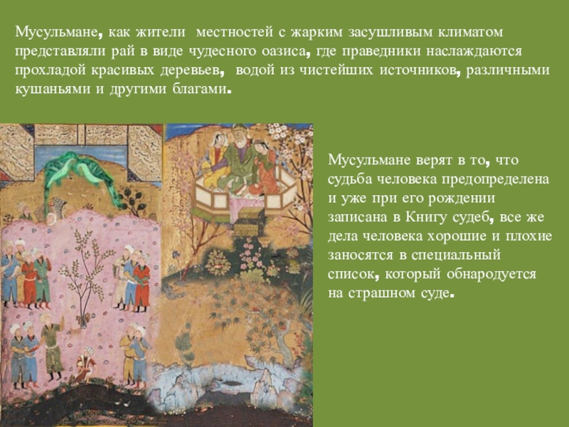 жизни. А после смерти каждого ждет страшный суд, где каждому воздастся по делам его. Представления о бессмертии души, загробной жизни и страшном суде были восприняты Мухаммедом от христианства.