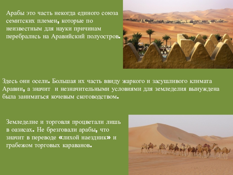 Земледелие и торговля процветали лишь в оазисах. Не брезговали арабы, что значит в переводе «лихой наездник» и грабежом торговых караванов.