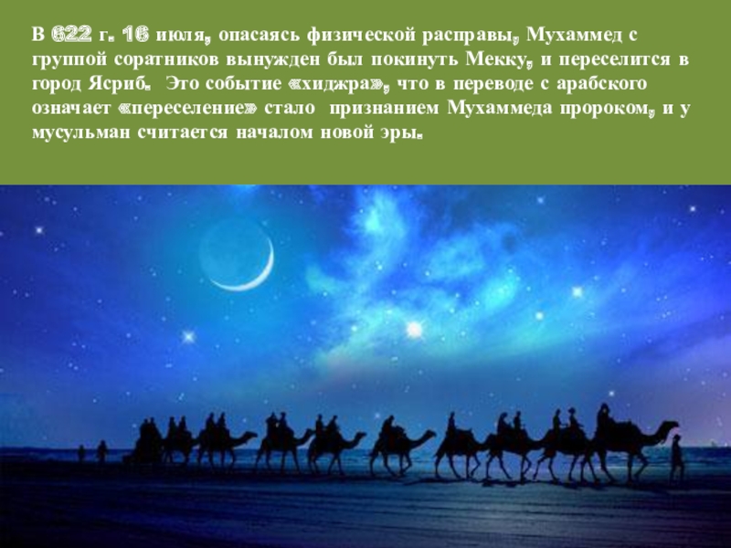 Слайд 16В 622 г. 16 июля, опасаясь физической расправы, Мухаммед с