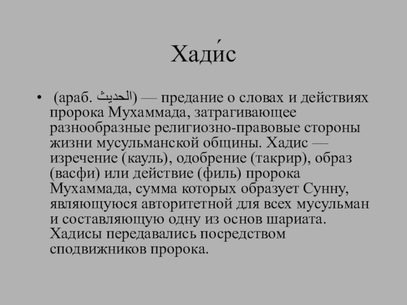 Мухаммада, затрагивающее разнообразные религиозно-правовые стороны жизни мусульманской общины. Хадис —