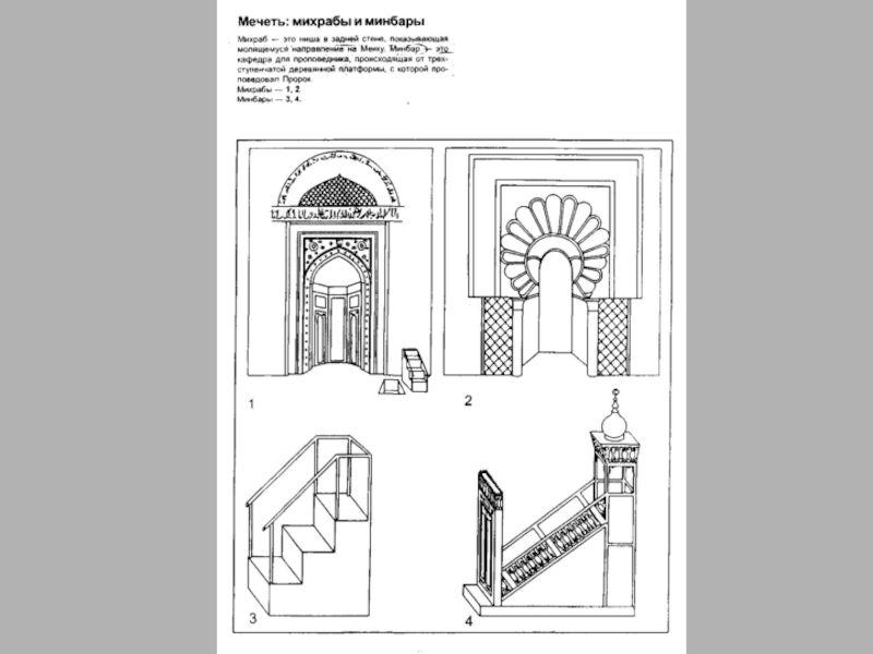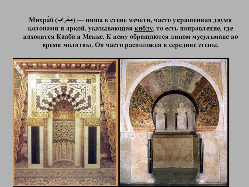 Слайд 33Михра́б (مِحْراب) — ниша в стене мечети, часто украшенная двумя