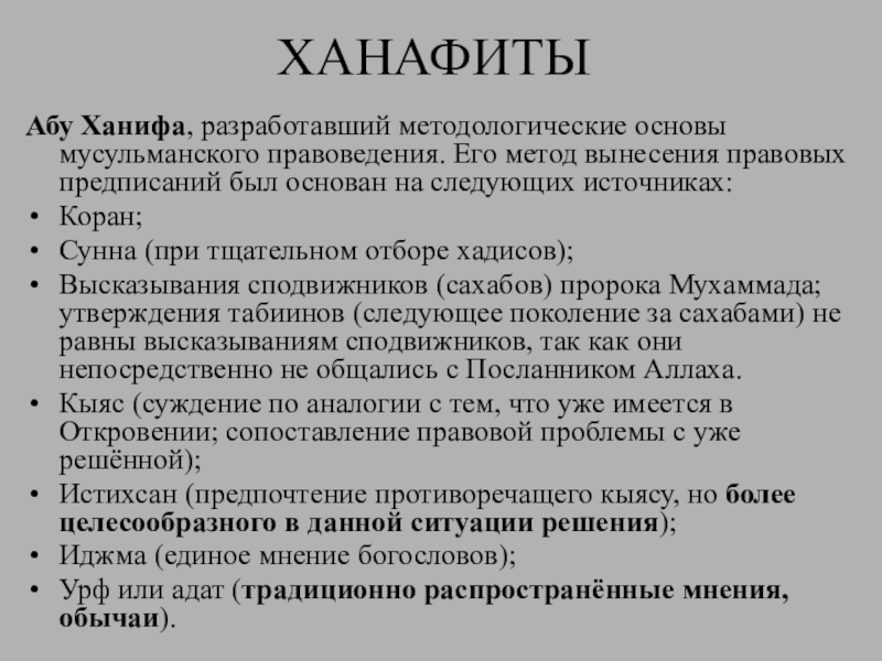 Кыяс, истислах. Истихсан он понимал по-своему, считая, что если по какой-то проблеме нет ясности (насс) в Откровении, то необходимо применить предпочтительное решение проблемы независимо от того, имеется возможность кыяса (суждения по аналогии) или нет. Это он назвал истислахом.