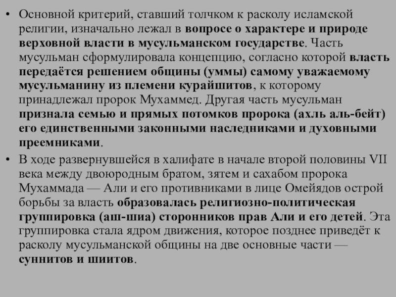 Слайд 8Основной критерий, ставший толчком к расколу исламской религии, изначально лежал