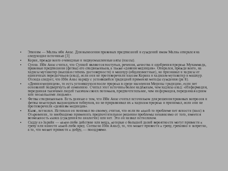 Слайд 22Эпоним — Малик ибн Анас. Для вынесения правовых предписаний и