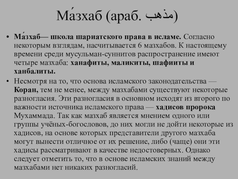 Ма́зхаб— школа шариатского права в исламе. Согласно некоторым