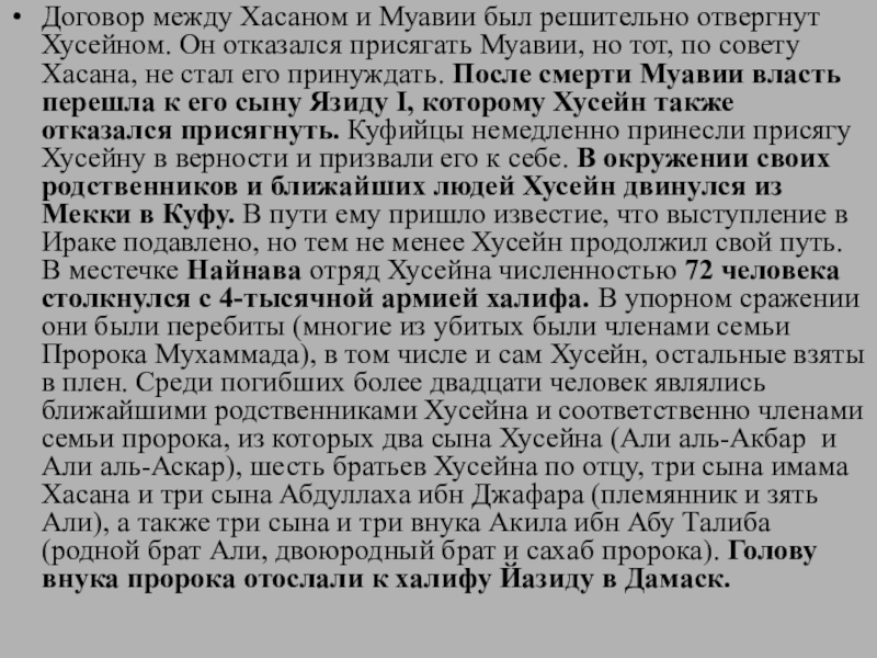 его принуждать. После смерти Муавии власть перешла к его сыну Язиду I, которому Хусейн также отказался присягнуть. Куфийцы немедленно принесли присягу Хусейну в верности и призвали его к себе. В окружении своих родственников и ближайших людей Хусейн двинулся из Мекки в Куфу. В пути ему пришло известие, что выступление в Ираке подавлено, но тем не менее Хусейн продолжил свой путь. В местечке Найнава отряд Хусейна численностью 72 человека столкнулся с 4-тысячной армией халифа. В упорном сражении они были перебиты (многие из убитых были членами семьи Пророка Мухаммада), в том числе и сам Хусейн, остальные взяты в плен. Среди погибших более двадцати человек являлись ближайшими родственниками Хусейна и соответственно членами семьи пророка, из которых два сына Хусейна (Али аль-Акбар и Али аль-Аскар), шесть братьев Хусейна по отцу, три сына имама Хасана и три сына Абдуллаха ибн Джафара (племянник и зять Али), а также три сына и три внука Акила ибн Абу Талиба (родной брат Али, двоюродный брат и сахаб пророка). Голову внука пророка отослали к халифу Йазиду в Дамаск.