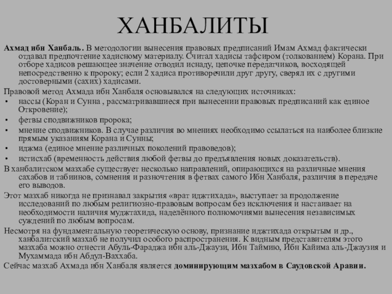 Несмотря на фундаментальную теоретическую основу, признание иджтихада открытым и др., ханбалитский мазхаб не получил особого распространения. К видным представителям этого мазхаба можно отнести Абуль-Фараджа ибн аль-Джаузи, Ибн Таймию, Ибн Кайима аль-Джаузия и Мухаммада ибн Абдул-Ваххаба.