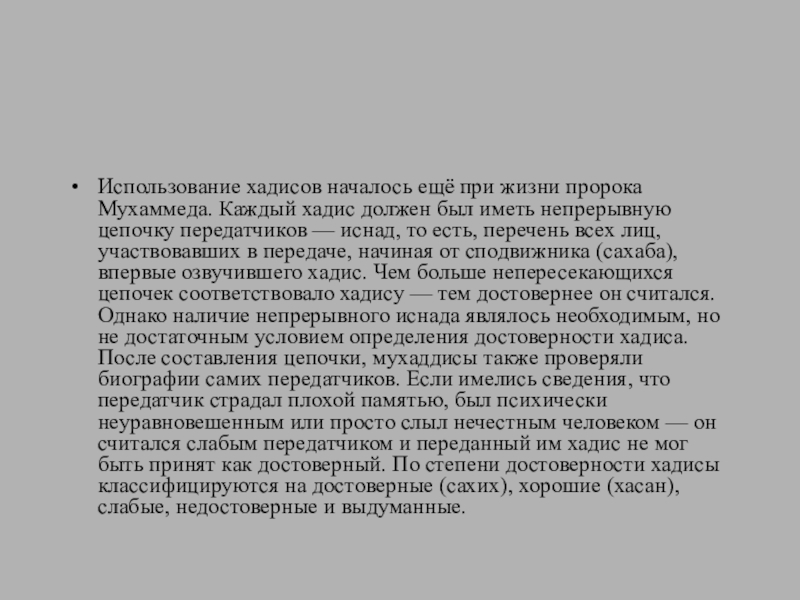 Слайд 26Использование хадисов началось ещё при жизни пророка Мухаммеда. Каждый хадис