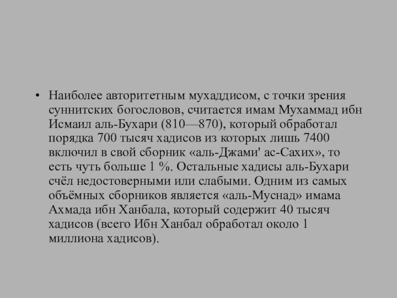 хадисов из которых лишь 7400 включил в свой сборник «аль-Джами' ас-Сахих», то есть чуть больше 1 %. Остальные хадисы аль-Бухари счёл недостоверными или слабыми. Одним из самых объёмных сборников является «аль-Муснад» имама Ахмада ибн Ханбала, который содержит 40 тысяч хадисов (всего Ибн Ханбал обработал около 1 миллиона хадисов).