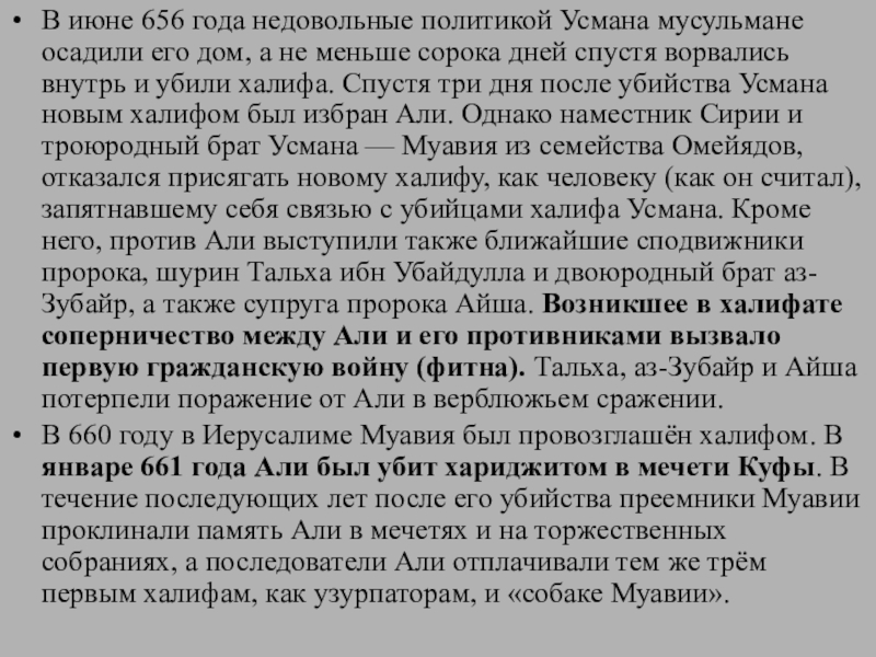 убили халифа. Спустя три дня после убийства Усмана новым халифом был избран Али. Однако наместник Сирии и троюродный брат Усмана — Муавия из семейства Омейядов, отказался присягать новому халифу, как человеку (как он считал), запятнавшему себя связью с убийцами халифа Усмана. Кроме него, против Али выступили также ближайшие сподвижники пророка, шурин Тальха ибн Убайдулла и двоюродный брат аз-Зубайр, а также супруга пророка Айша. Возникшее в халифате соперничество между Али и его противниками вызвало первую гражданскую войну (фитна). Тальха, аз-Зубайр и Айша потерпели поражение от Али в верблюжьем сражении.