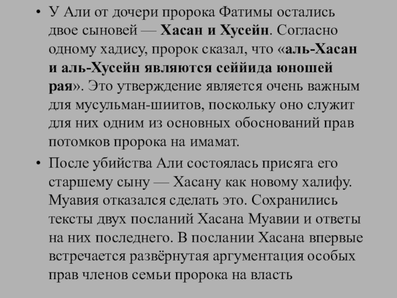 После убийства Али состоялась присяга его старшему сыну — Хасану как новому халифу. Муавия отказался сделать это. Сохранились тексты двух посланий Хасана Муавии и ответы на них последнего. В послании Хасана впервые встречается развёрнутая аргументация особых прав членов семьи пророка на власть
