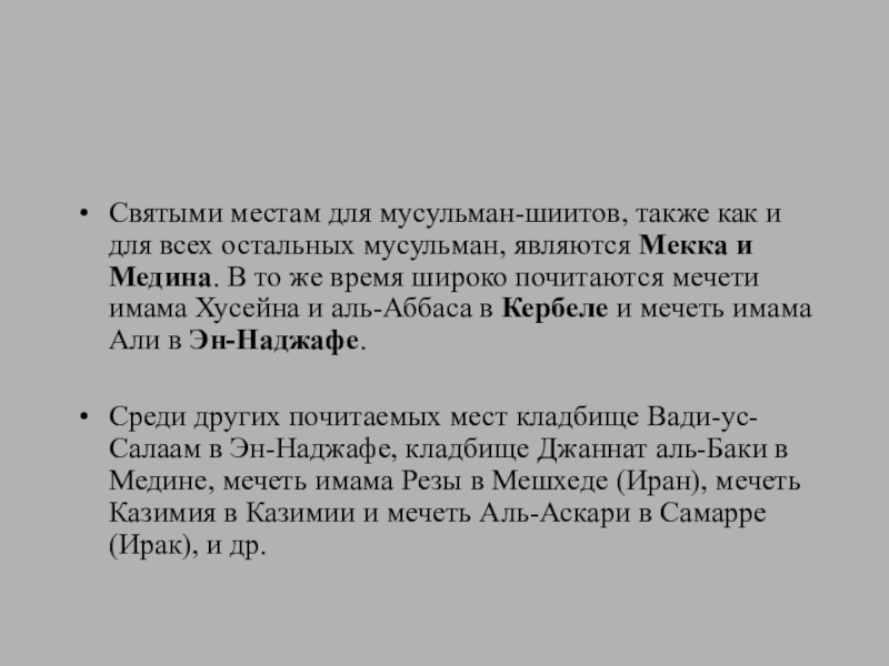 Слайд 16Святыми местам для мусульман-шиитов, также как и для всех остальных
