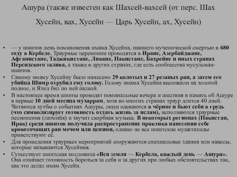Слайд 18Ашура (также известен как Шахсей-вахсей (от перс. Шах Хусейн, вах,