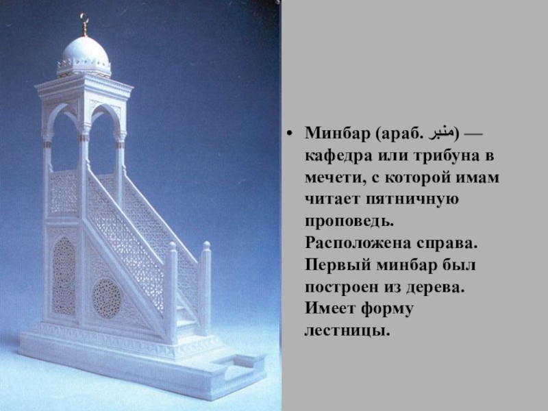Слайд 36Минбар (араб. منبر) — кафедра или трибуна в мечети, с