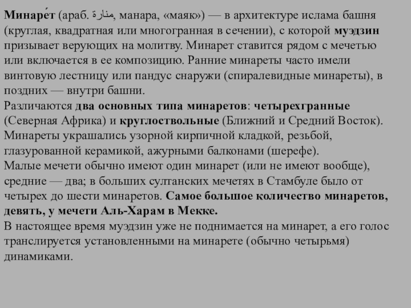 Слайд 37Минаре́т (араб. منارة, манара, «маяк») — в архитектуре ислама башня