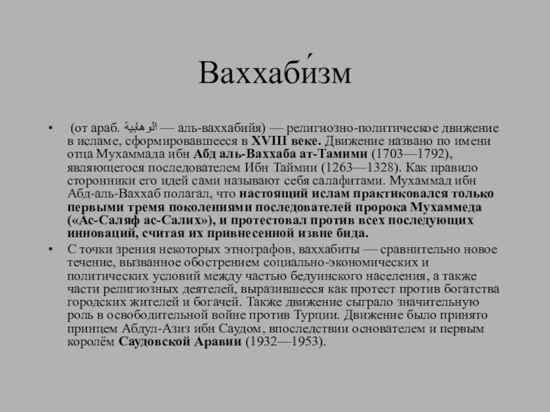 Мухаммада ибн Абд аль-Ваххаба ат-Тамими (1703—1792), являющегося последователем Ибн Таймии (1263—1328). Как правило сторонники его идей сами называют себя салафитами. Мухаммад ибн Абд-аль-Ваххаб полагал, что настоящий ислам практиковался только первыми тремя поколениями последователей пророка Мухаммеда («Ас-Саляф ас-Салих»), и протестовал против всех последующих инноваций, считая их привнесенной извне бида.