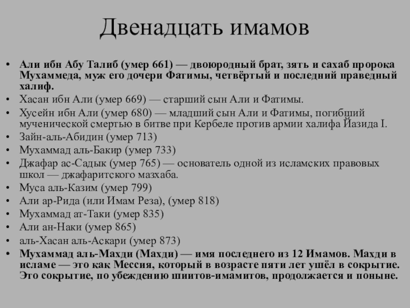 Мухаммад аль-Махди (Махди) — имя последнего из 12 Имамов. Махди в исламе — это как Мессия, который в возрасте пяти лет ушёл в сокрытие. Это сокрытие, по убеждению шиитов-имамитов, продолжается и поныне.