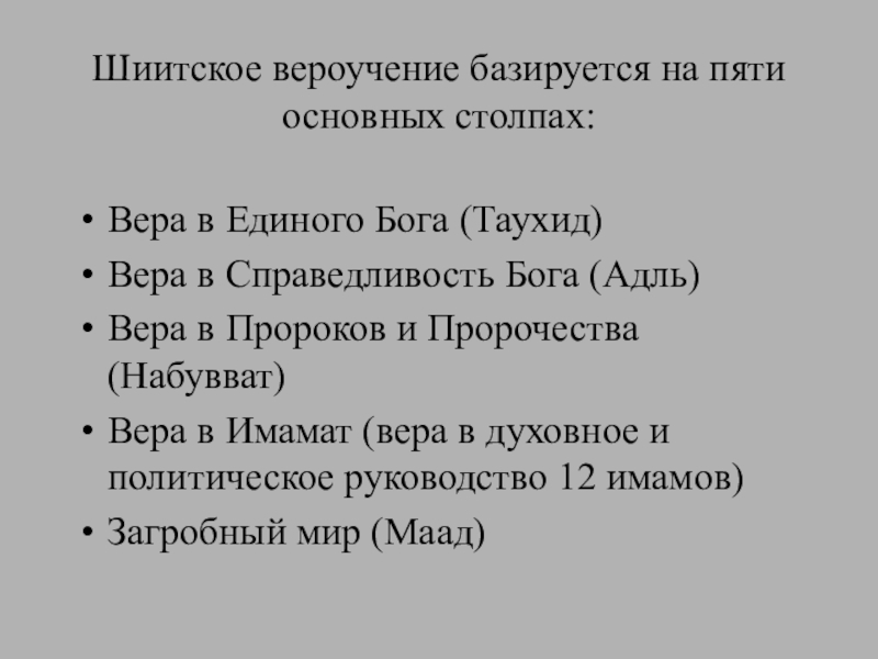 Слайд 14Шиитское вероучение базируется на пяти основных столпах: