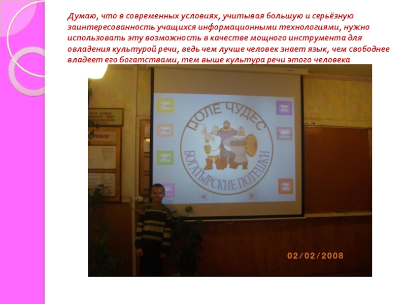 интересным и динамичным, «погрузить» ученика в обстановку какой-либо исторической эпохи, наблюдать литературного героя, создать иллюзию соучастия, сопереживания. Предметы русский язык и литература не являются исключением, ибо ученик с интересом и увлечением работает на уроке, решая тренинги, видит плоды своего труда и может их оценить. Также постоянная работа по подготовке занятий с использованием ИКТ открывает новые возможности для моего творческого роста и профессионального развития .