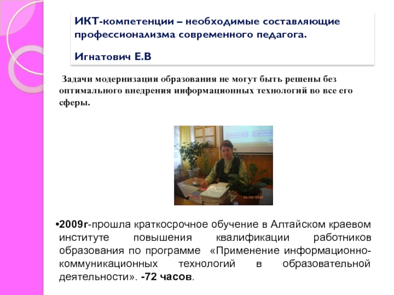 2009г-прошла краткосрочное обучение в Алтайском краевом институте повышения квалификации работников образования по программе «Применение информационно-коммуникационных технологий в образовательной деятельности». -72 часов.