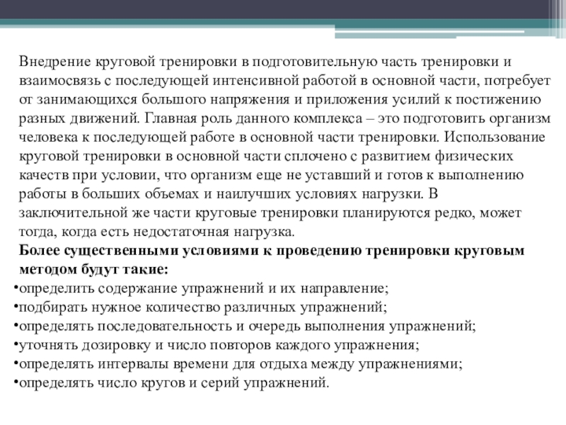 напряжения и приложения усилий к постижению разных движений. Главная роль данного комплекса – это подготовить организм человека к последующей работе в основной части тренировки. Использование круговой тренировки в основной части сплочено с развитием физических качеств при условии, что организм еще не уставший и готов к выполнению работы в больших объемах и наилучших условиях нагрузки. В заключительной же части круговые тренировки планируются редко, может тогда, когда есть недостаточная нагрузка.