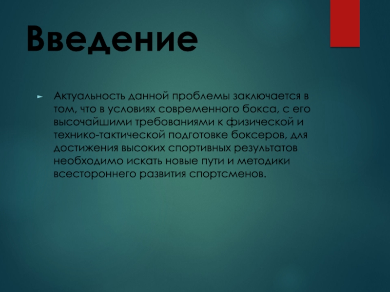 Введение Актуальность данной проблемы заключается в том, что в условиях современного бокса, с его высочайшими требованиями к