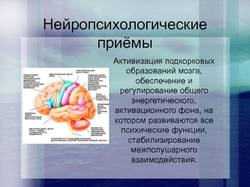 Нейропсихологические приёмыАктивизация подкорковых образований мозга, обеспечение и регулирование общего энергетического, активационного фона, на котором развиваются все психические