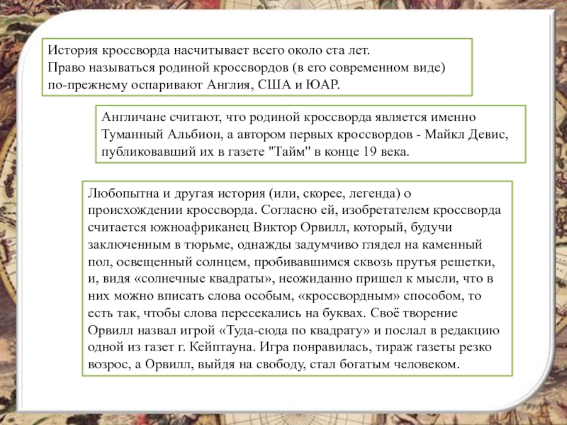 Англичане считают, что родиной кроссворда является именно Туманный Альбион, а автором первых кроссвордов - Майкл Девис, публиковавший их в газете "Тайм" в конце 19 века.