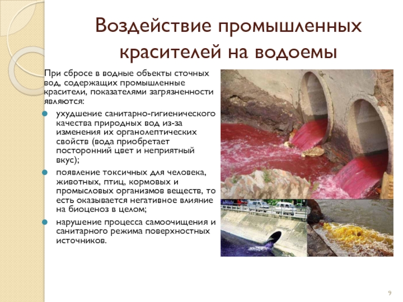 Слайд 9Воздействие промышленных красителей на водоемы